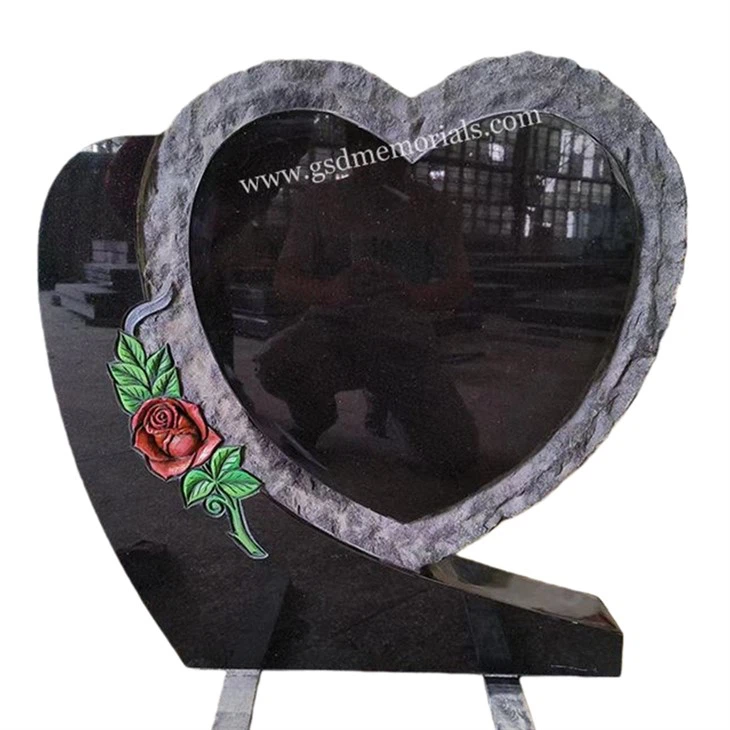 DerHerzgedenklichkeit mit Roseist aus Premium Indian Black Granit geschnitzt. Es verfügt über ein herzförmiges Design mit einer natürlichen rustikalen Kante und einem handbemalten Rosenmotiv.
